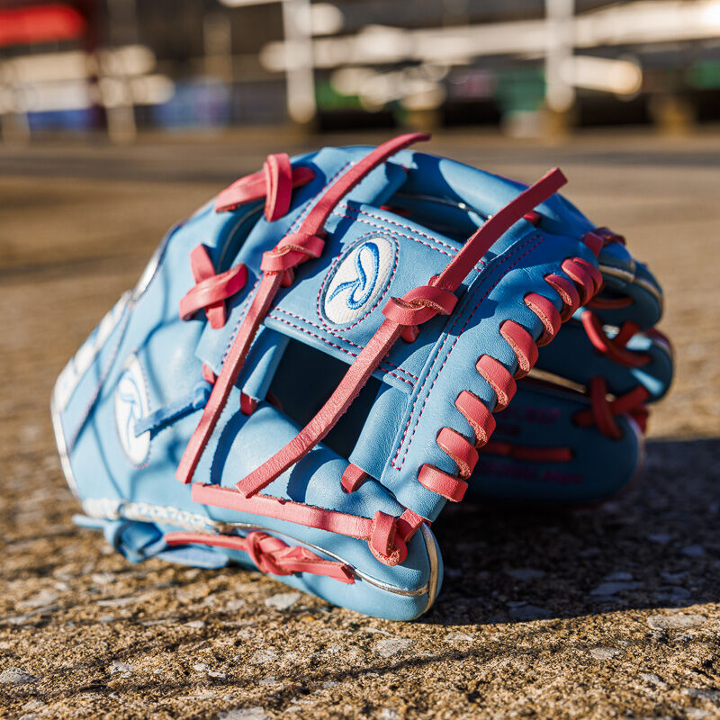 Stand out on the field with this exclusive 11.5-inch Rawlings R2G Heart of the Hide pink and Columbia blue infield glove!
